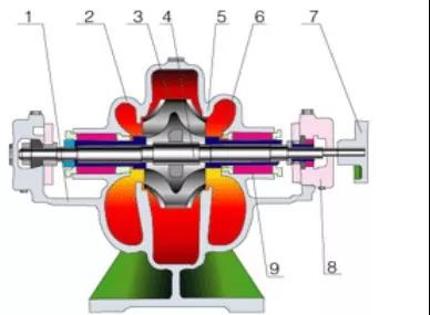 1、 泵體  2、泵蓋  3、葉輪  4、軸  5、雙吸密封環  6、軸套  7、聯軸軸器