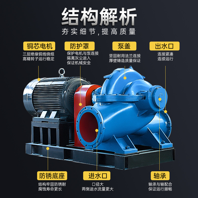 綜上所述,大流量雙吸泵的選型需要綜合考慮工程需求、運行環境、可靠性、效率、余量設計以及維護等因素。通過科學合理的選型,可以確保大流量雙吸泵能夠穩定高效地運行,為工業生產提供可靠的支持。